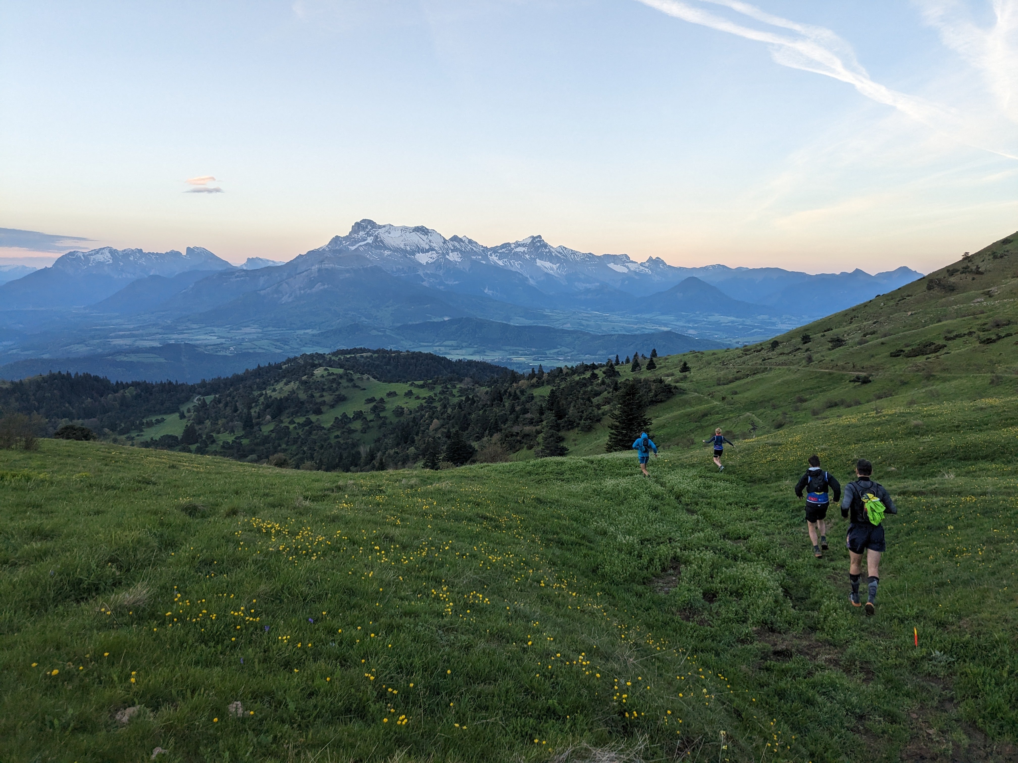 Après deux heures, nous basculons au sommet au col du Sénépy. L’Obiou et ses neiges, éternelles pour encore quelques semaines, tout juste commencent à rosir. Au loin, l’horizon est pâle, jaune fébrile mais conquérant, un ciel dégagé éclatant, ça sent la chaude journée de printemps. Les herbes sont chargées de la rosée matinale, lourdes comme des bottes de foin. On coupe sec à la descente, pas de chemin, on azimute la pente en fauchant les blés de nos larges compas détrempés, quelques kilomètres herbacés et aérés, belvédère sur la vallée, avant de retrouver les futaies, graviers puis vilaine route goudronnée, jusqu’à couper la ligne d’arrivée, enfin réveillés, fatigués et emboués.