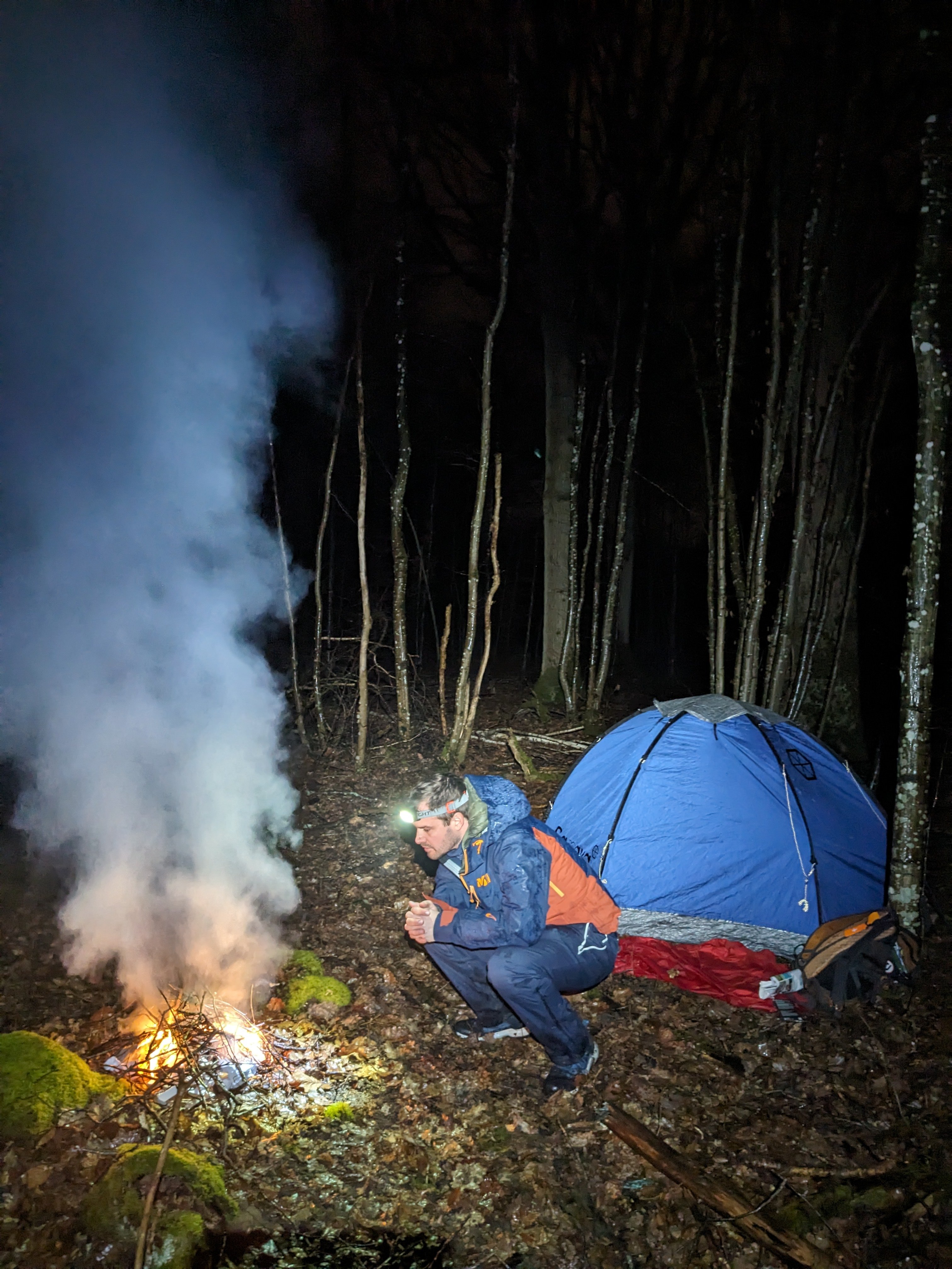 On marche encore un peu, histoire de, et on plante la tente là, un peu au hasard, au milieu de rien. Un peu de papier, quelques bouts de carton, une pyramide de brindilles, et un timide feu démarre. Suffisant pour créer un halo de chaleur, un foyer rougeoyant autour duquel on s’assoit sur deux souches recouvertes de mousse, deux souches bouffées par les mites et l’âge qui craquent et s’affaissent sous notre poids, avant de s’immobiliser dans un râle en forme de dernière volonté.